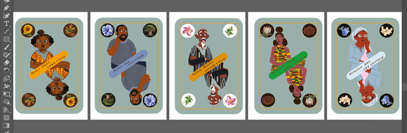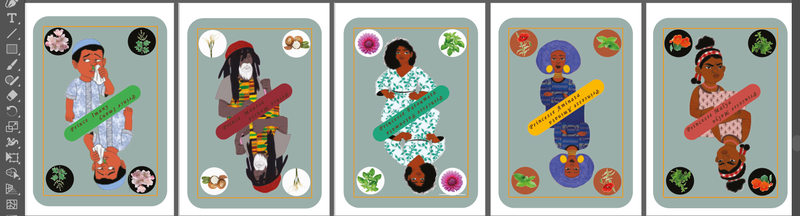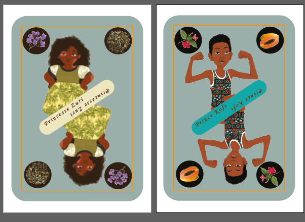 J'ai donc dû dessiner de moi même les visuels (personnages et accesoires) sur illustrator puis faire le design des cartes (cartes basiques et cartes actions).